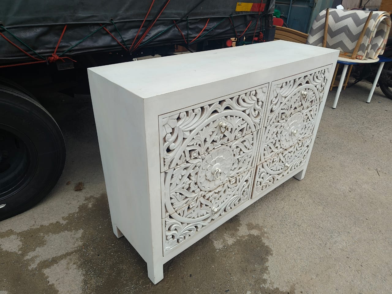 A beautiful solid wood chest of 6 drawers in white is now in our store, QQ Furniture, a second hand furniture in Skudai.