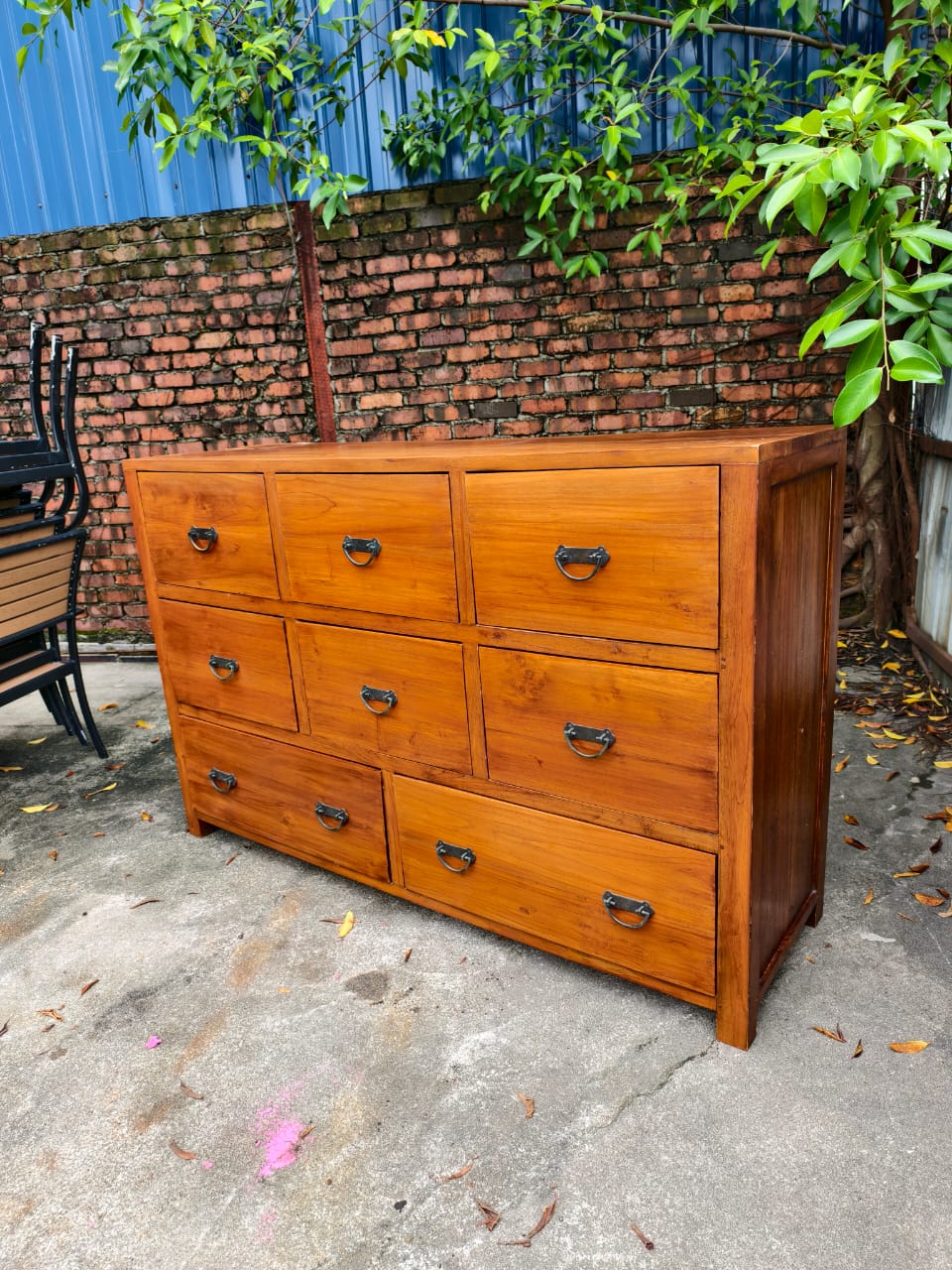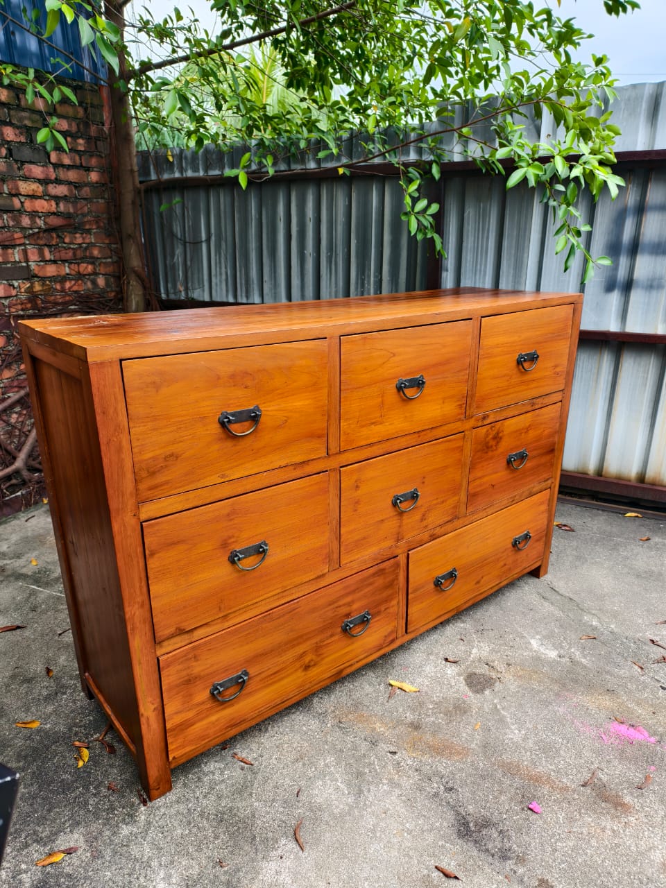 This second hand chest of drawers, is a solid and high quality teak wood. Chest of 8 drawers, is rare products, can be used as console table. If you are looking for preloved console table, come and grab ya.
